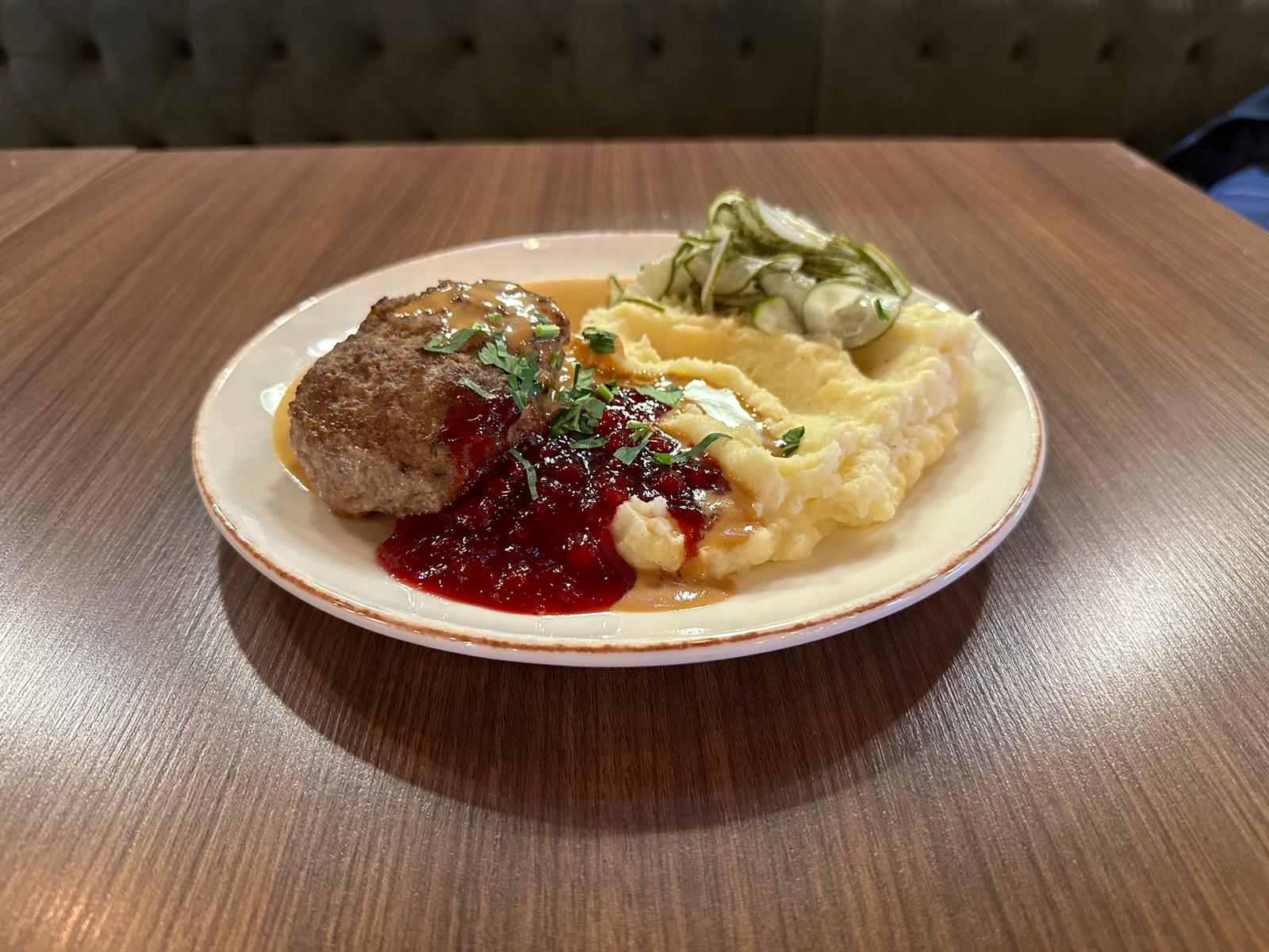 Stora köttbullar, potatispuré, gräddsås, rårörda lingon & pressgurka